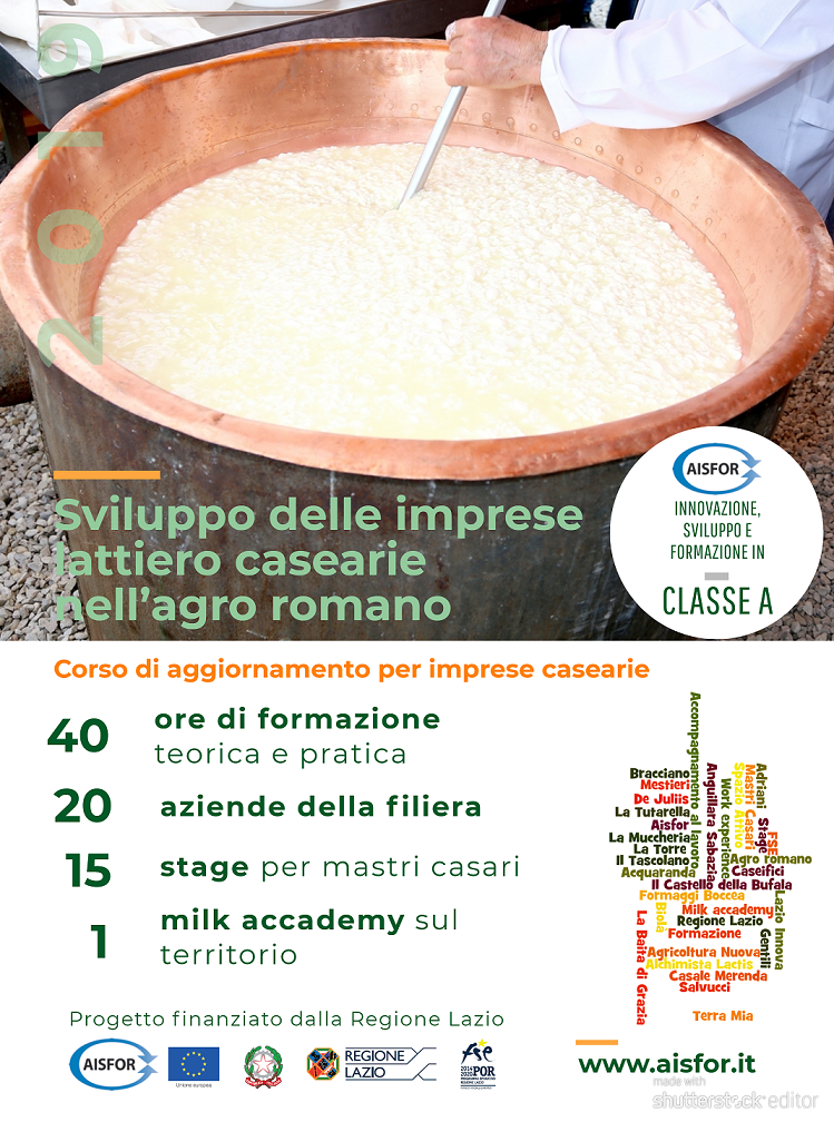 Mer. 31 ottobre alle ore 11.30 Aisfor in collaborazione con lo Spazio Attivo Lazio Innova organizza l’incontro dedicato alle aziende di trasformazione lattiero casearia del territorio per illustrare le azioni previste e le opportunità messe a disposizione dal progetto, presso la sede delle attività formative pratiche in Via di Valle Foresta, 6 – Bracciano (Spazio Attivo Lazio Innova)