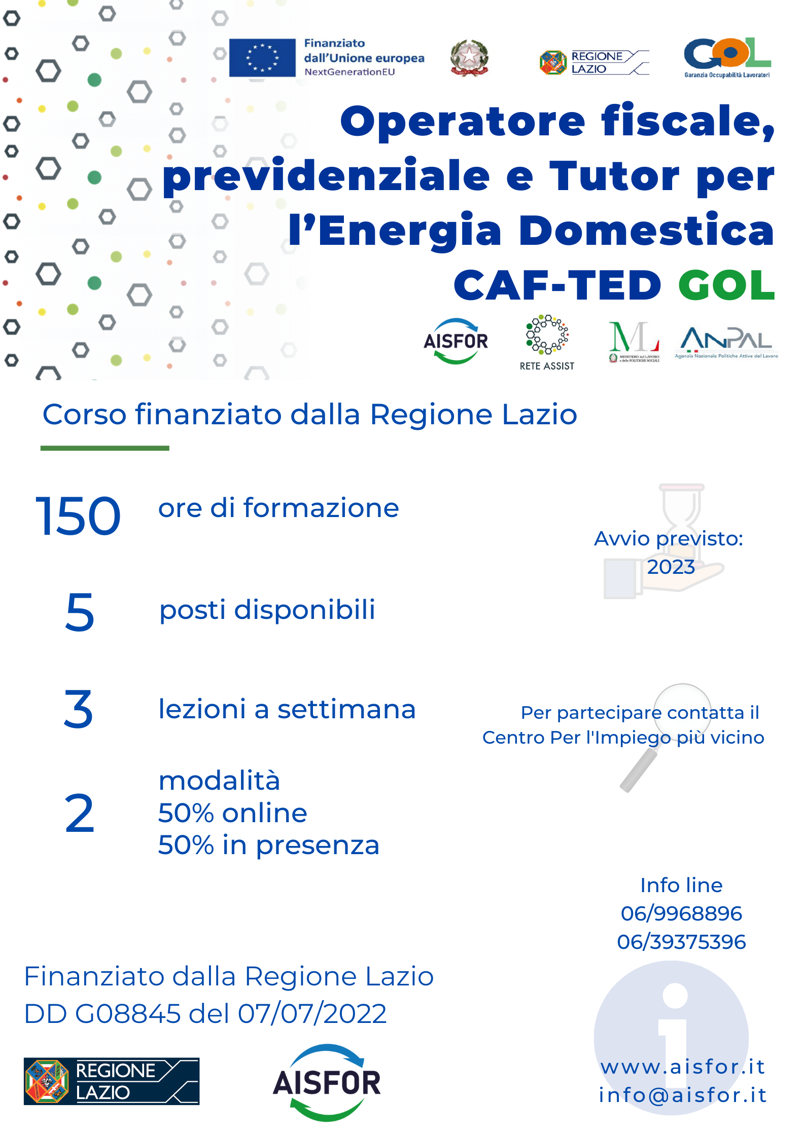 Aisfor organizza la prima edizione del corso di formazione di 150 ore per "Operatore fiscale, previdenziale e Tutor per l’energia domestica CAF-TED GOL" finanziato dalla Regione Lazio nell’ambito del programma Garanzia Occupazione Lavoratori (GOL).